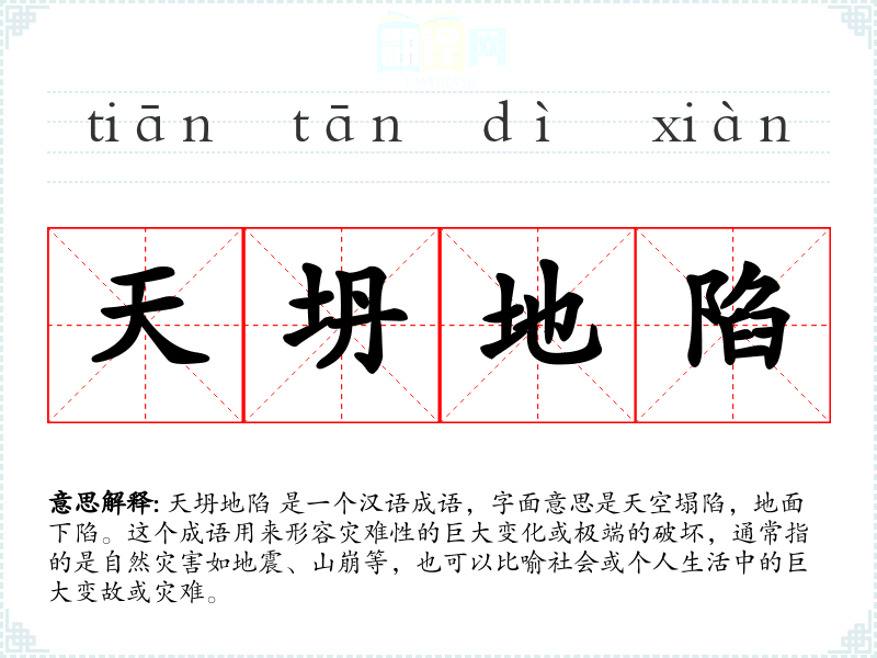 天坍地陷 是一个汉语成语,字面意思是天空塌陷,地面下陷。这个成语用来形容灾难性的巨大变化或极端的破坏,通常指的是自然灾害如地震、山崩等,也可以比喻社会或个人生活中的巨大变故或灾难。