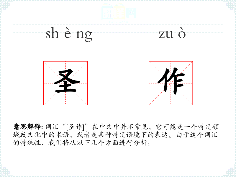 由于“圣作”不是一个常用词汇,其词源和演变可能与文化和艺术发展密切相关。在文化中,“圣”字常与神圣、尊贵相关联,而“作”则指作品或创作。