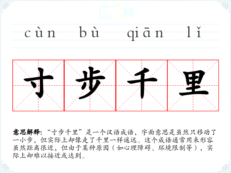 “寸步千里”这个成语深刻地揭示了距离的多维性,不仅仅是物理上的,更是心理和社会上的。在语言学*和表达中,它提醒我们要注意那些看似微小却可能阻碍我们前进的障碍,无论是人际关系还是个人目标。通过理解和运用这个成语,我们可以更深刻地把握语言的细腻和文化的深度。