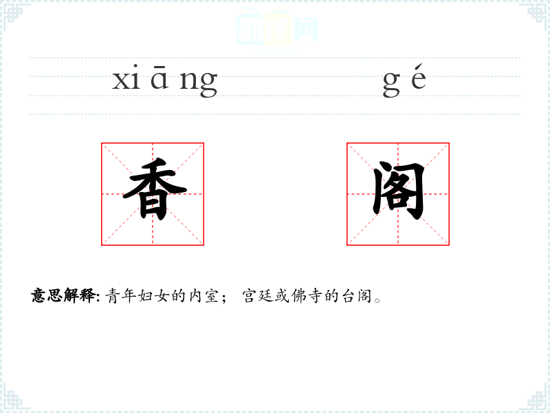 青年妇女的内室; 宫廷或佛寺的台阁。