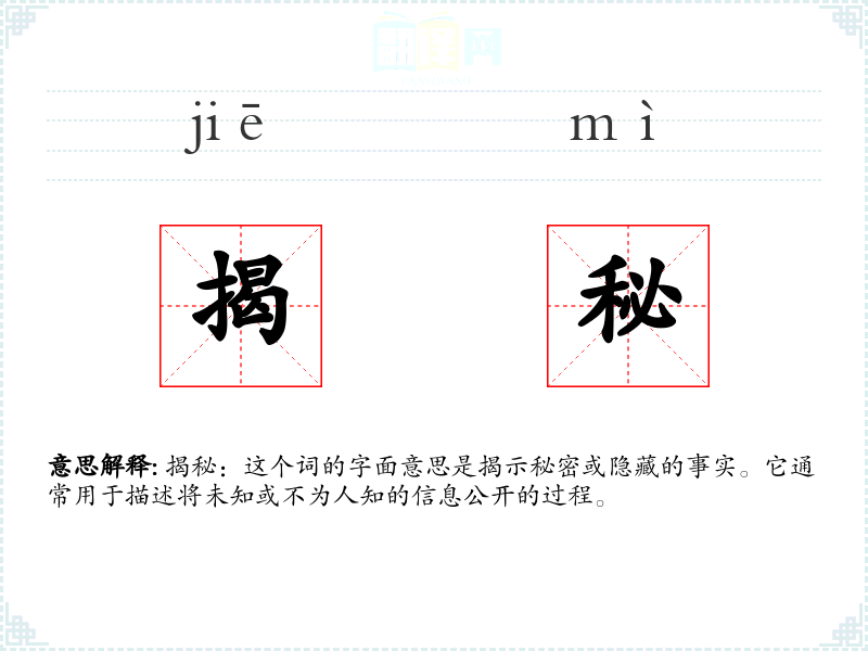 揭秘:这个词的字面意思是揭示秘密或隐藏的事实。它通常用于描述将未知或不为人知的信息公开的过程。