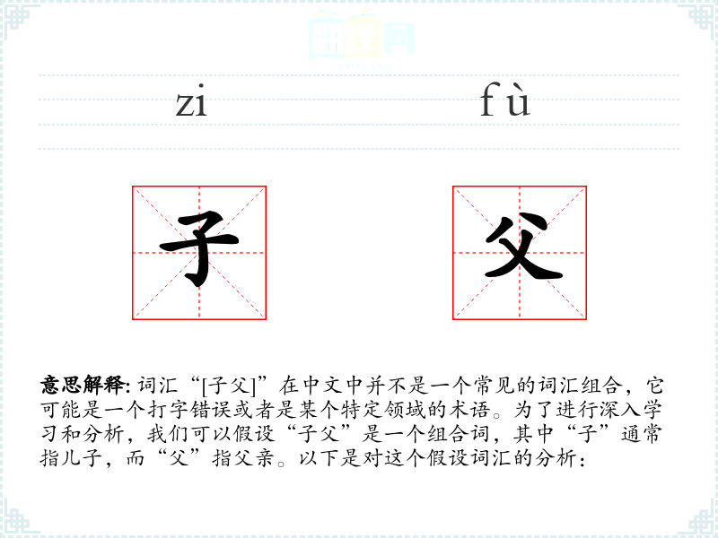 词汇“[子父]”在中文中并不是一个常见的词汇组合,它可能是一个打字错误或者是某个特定领域的术语。为了进行深入学*和分析,我们可以假设“子父”是一个组合词,其中“子”通常指儿子,而“父”指父亲。以下是对这个假设词汇的分析: