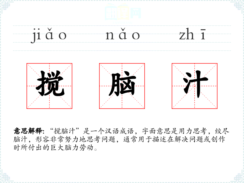 “搅脑汁”是一个汉语成语,字面意思是用力思考,绞尽脑汁,形容非常努力地思考问题,通常用于描述在解决问题或创作时所付出的巨大脑力劳动。
