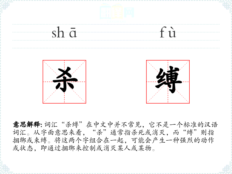 在某些文化或社会背景中,“杀缚”可能会被用来形容一种极端的控制或束缚手段,尤其是在描述暴力或战争场景时。它可能与某些文化中的暴力或强制行为有关。