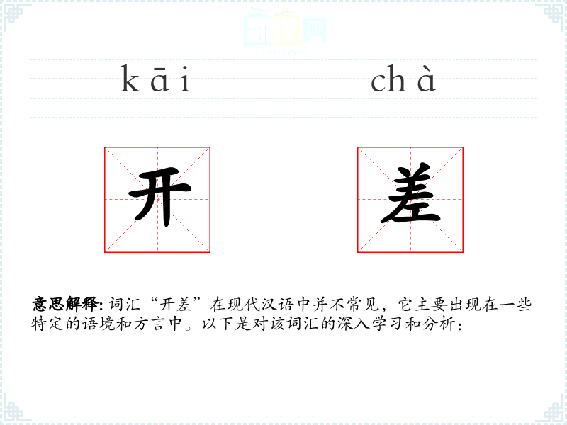 词汇“开差”在现代汉语中并不常见,它主要出现在一些特定的语境和方言中。以下是对该词汇的深入学习和分析: