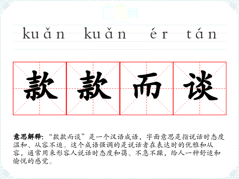 “款款而谈”这个成语的词源较为模糊,但其结构和意义在古代汉语中已有体现。随着时间的推移,这个成语的使用逐渐固定下来,成为描述温和谈话方式的常用表达。