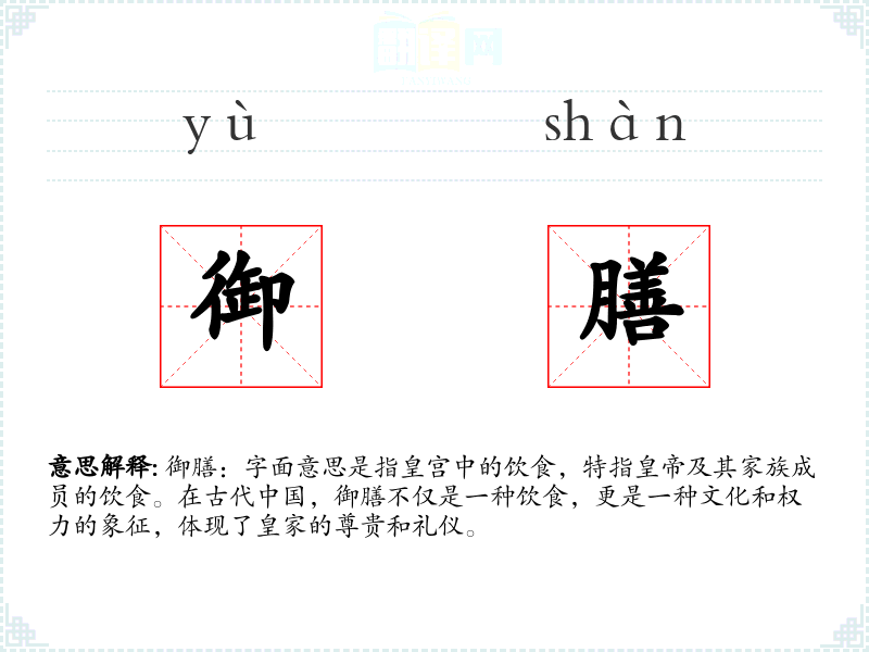 御膳:字面意思是指皇宫中的饮食,特指及其家族成员的饮食。在古代,御膳不仅是一种饮食,更是一种文化和权力的象征,体现了皇家的尊贵和礼仪。