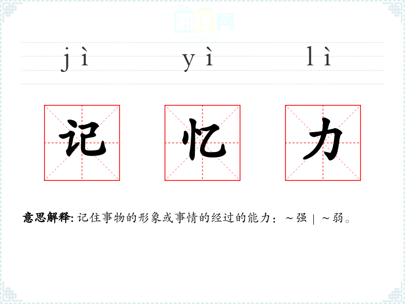 记住事物的形象或事情的经过的能力:~强|~弱。