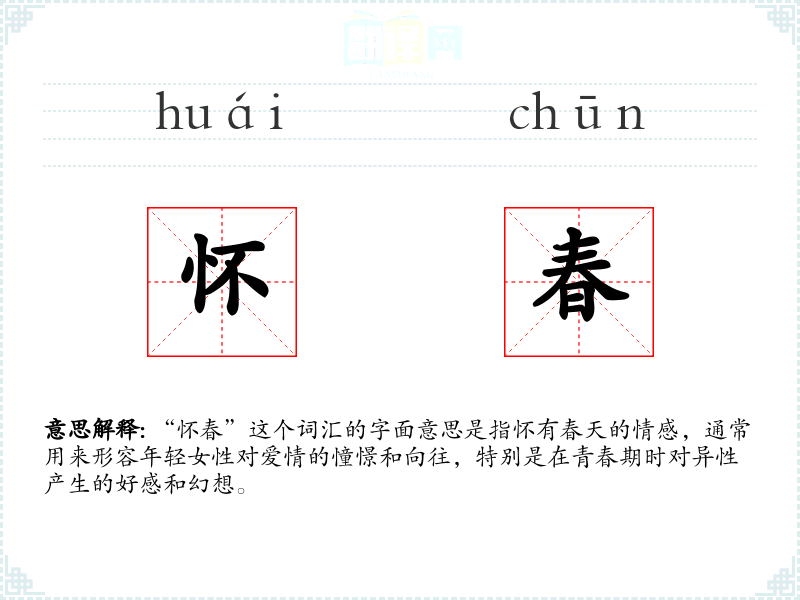 “怀春”这个词汇的字面意思是指怀有春天的情感,通常用来形容年轻女性对爱情的憧憬和向往,特别是在青春期时对异性产生的好感和幻想。