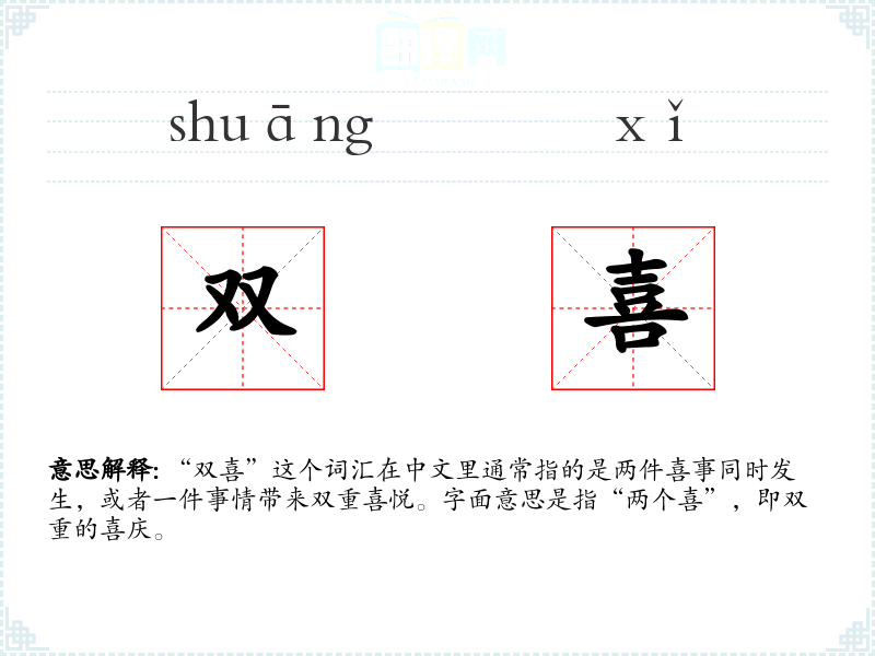 “双喜”这个词汇在中文里通常指的是两件喜事同时发生,或者一件事情带来双重喜悦。字面意思是指“两个喜”,即双重的喜庆。