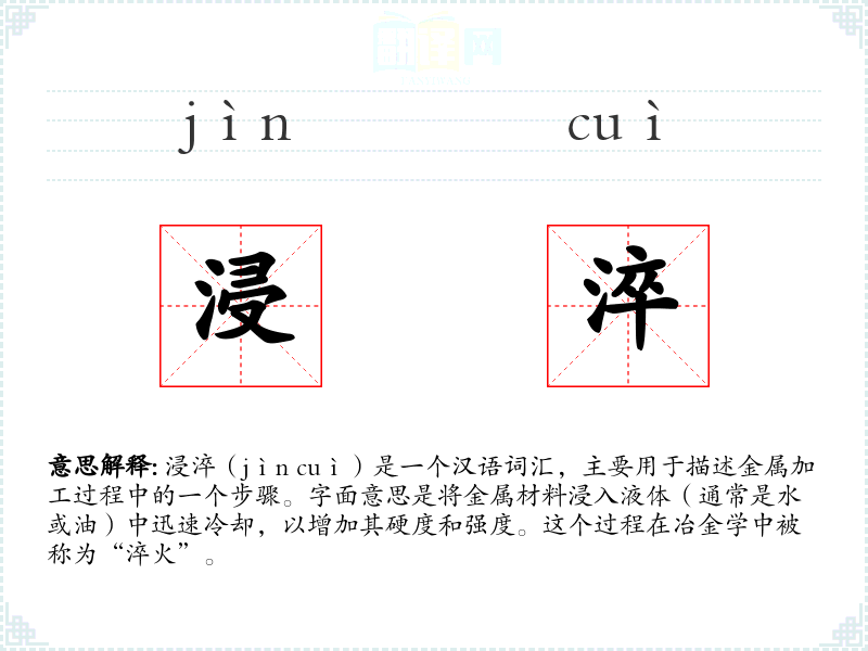 浸淬(jìn cuì)是一个汉语词汇,主要用于描述金属加工过程中的一个步骤。字面意思是将金属材料浸入液体(通常是水或油)中迅速冷却,以增加其硬度和强度。这个过程在冶金学中被称为“淬火”。