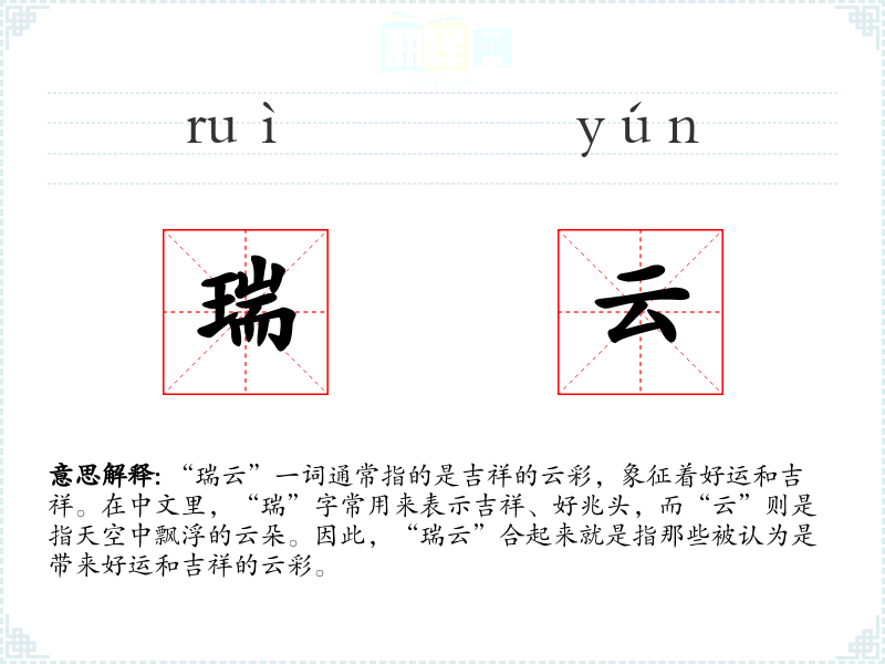 “瑞云”一词通常指的是吉祥的云彩,象征着好运和吉祥。在中文里,“瑞”字常用来表示吉祥、好兆头,而“云”则是指天空中飘浮的云朵。因此,“瑞云”合起来就是指那些被认为是带来好运和吉祥的云彩。