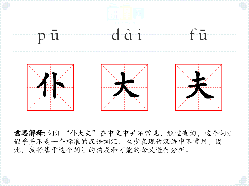 词汇“仆大夫”在中文中并不常见,经过查询,这个词汇似乎并不是一个标准的汉语词汇,至少在现代汉语中不常用。因此,我将基于这个词汇的构成和可能的含义进行分析。