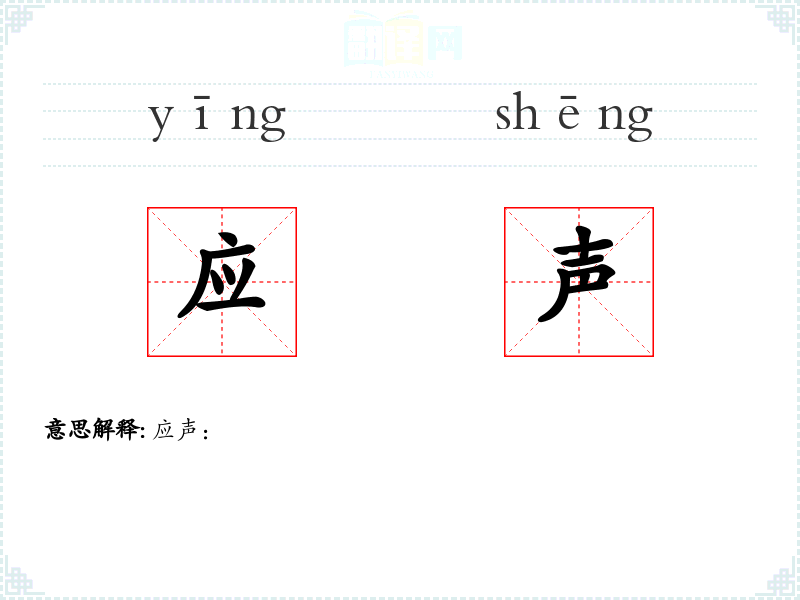 - 词源:应声一词源于古代汉语,字面意思即为“回应声音”。