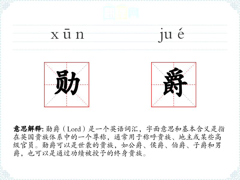 勋爵(Lord)是一个英语词汇,字面意思和基本含义是指在英国贵族体系中的一个尊称,通常用于称呼贵族、地主或某些高级官员。勋爵可以是世袭的贵族,如公爵、侯爵、伯爵、子爵和男爵,也可以是通过功绩被授予的终身贵族。