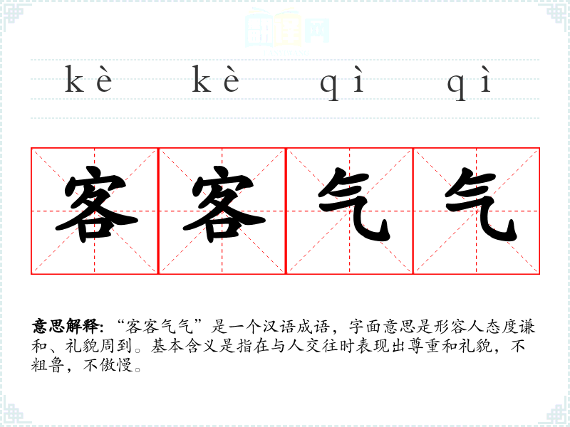 “客客气气”是一个汉语成语,字面意思是形容人态度谦和、礼貌周到。基本含义是指在与人交往时表现出尊重和礼貌,不粗鲁,不傲慢。