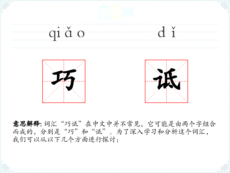 词汇“巧诋”在中文中并不常见,它可能是由两个字组合而成的,分别是“巧”和“诋”。为了深入学习和分析这个词汇,我们可以从以下几个方面进行探讨: