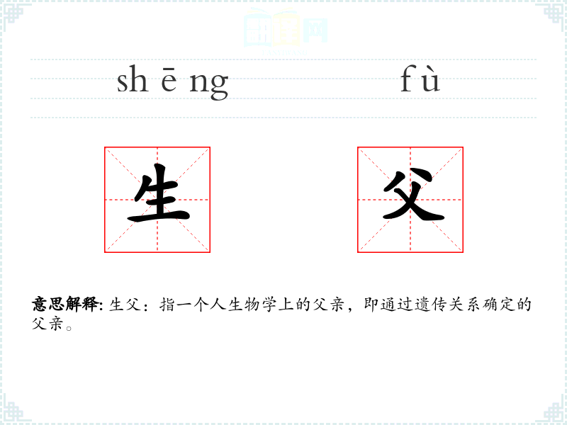 生父一词由“生”和“父”两个字组成。在古代汉语中,“生”指生育、出生,“父”指父亲。随着语言的发展,这两个字组合起来特指生物学上的父亲。