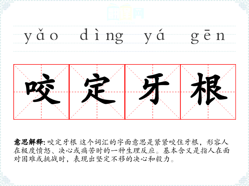 咬定牙根 这个词汇的字面意思是紧紧咬住牙根,形容人在极度愤怒、决心或痛苦时的一种生理反应。基本含义是指人在面对困难或挑战时,表现出坚定不移的决心和毅力。