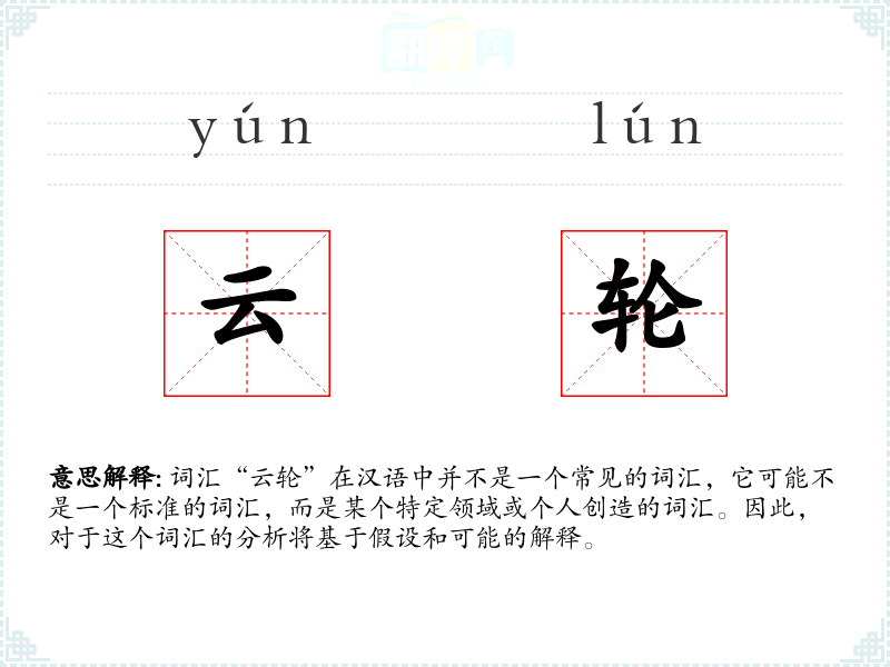 词汇“云轮”在汉语中并不是一个常见的词汇,它可能不是一个标准的词汇,而是某个特定领域或个人创造的词汇。因此,对于这个词汇的分析将基于假设和可能的解释。