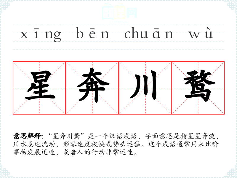 “星奔川鹜”是一个汉语成语,字面意思是指星星奔流,川水急速流动,形容速度极快或势头迅猛。这个成语通常用来比喻事物发展迅速,或者人的行动非常迅速。