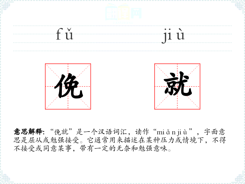 “俛就”是一个汉语词汇,读作“miǎn jiù”,字面意思是屈从或勉强接受。它通常用来描述在某种压力或情境下,不得不接受或同意某事,带有一定的无奈和勉强意味。
