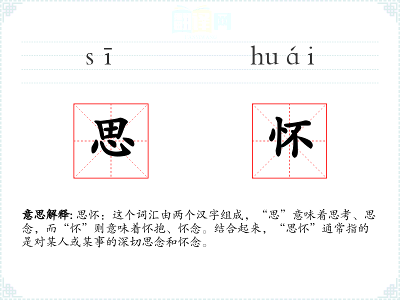 思怀:这个词汇由两个汉字组成,“思”意味着思考、思念,而“怀”则意味着怀抱、怀念。结合起来,“思怀”通常指的是对某人或某事的深切思念和怀念。