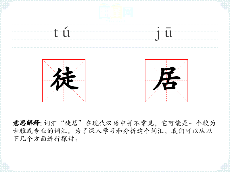 词汇“徒居”在现代汉语中并不常见,它可能是一个较为古雅或专业的词汇。为了深入学*和分析这个词汇,我们可以从以下几个方面进行探讨: