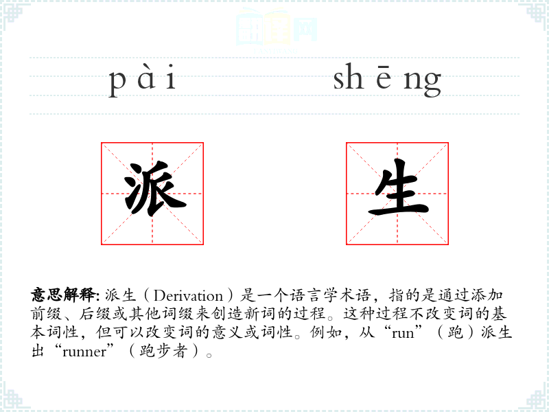 派生(Derivation)是一个语言学术语,指的是通过添加前缀、后缀或其他词缀来创造新词的过程。这种过程不改变词的基本词性,但可以改变词的意义或词性。例如,从“run”(跑)派生出“runner”(跑步者)。