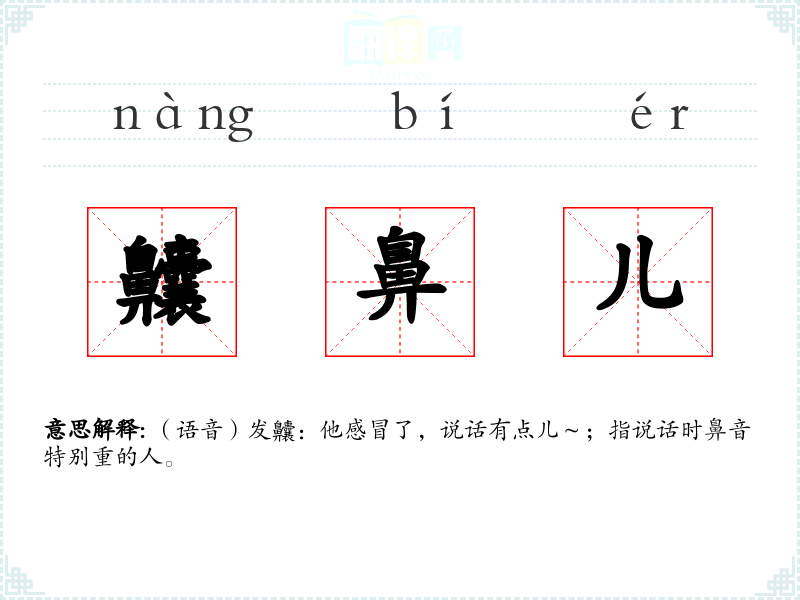 (语音)发齉:他感冒了,说话有点儿~;指说话时鼻音特别重的人。