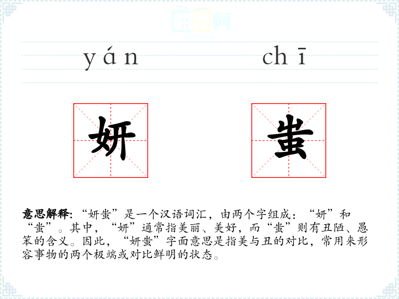“妍”字最早见于《说文解字》,意为美好。“蚩”字则较早见于《诗经》,意为愚笨或丑陋。这两个字组合成“妍蚩”,强调对比,可能在古代文学中逐渐形成并被广泛使用。