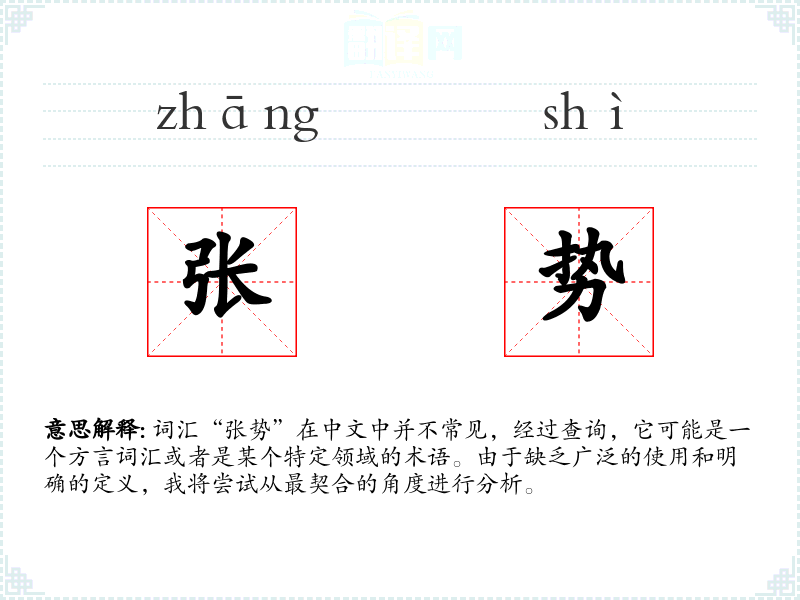 词汇“张势”在中文中并不常见,经过查询,它可能是一个方言词汇或者是某个特定领域的术语。由于缺乏广泛的使用和明确的定义,我将尝试从最契合的角度进行分析。