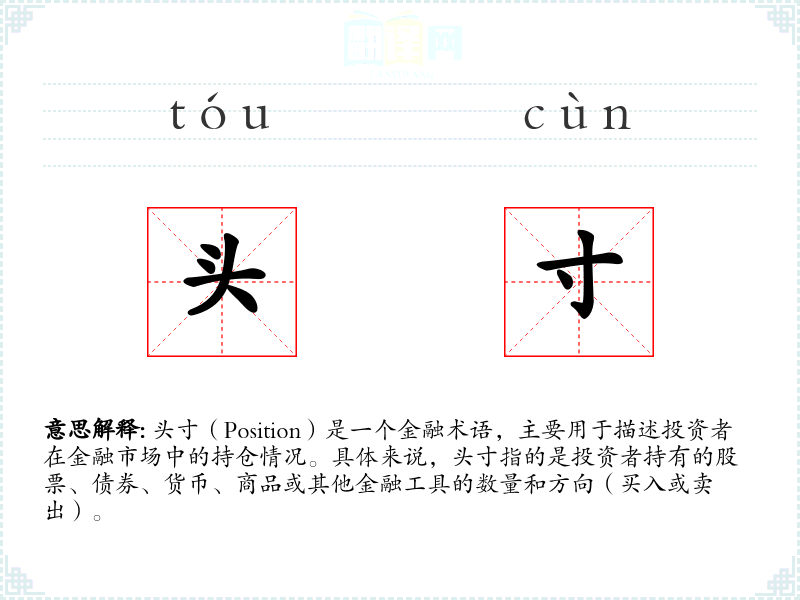 头寸(Position)是一个金融术语,主要用于描述投资者在金融市场中的持仓情况。具体来说,头寸指的是投资者持有的股票、债券、货币、商品或其他金融工具的数量和方向(买入或卖出)。