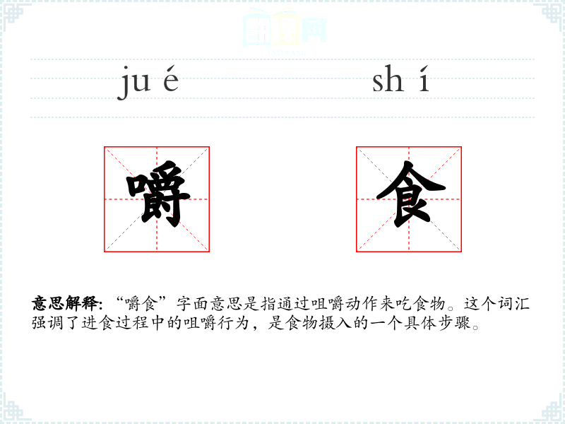 “嚼食”字面意思是指通过咀嚼动作来吃食物。这个词汇强调了进食过程中的咀嚼行为,是食物摄入的一个具体步骤。