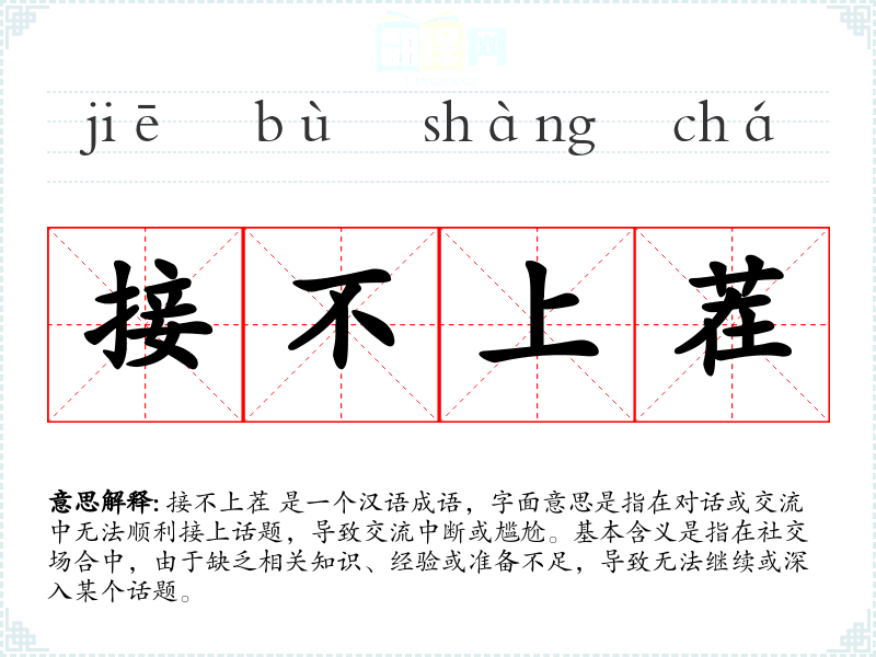 接不上茬 是一个汉语成语,字面意思是指在对话或交流中无法顺利接上话题,导致交流中断或尴尬。基本含义是指在社交场合中,由于缺乏相关知识、经验或准备不足,导致无法继续或深入某个话题。
