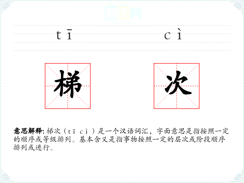梯次(tī cì)是一个汉语词汇,字面意思是指按照一定的顺序或等级排列。基本含义是指事物按照一定的层次或阶段顺序排列或进行。