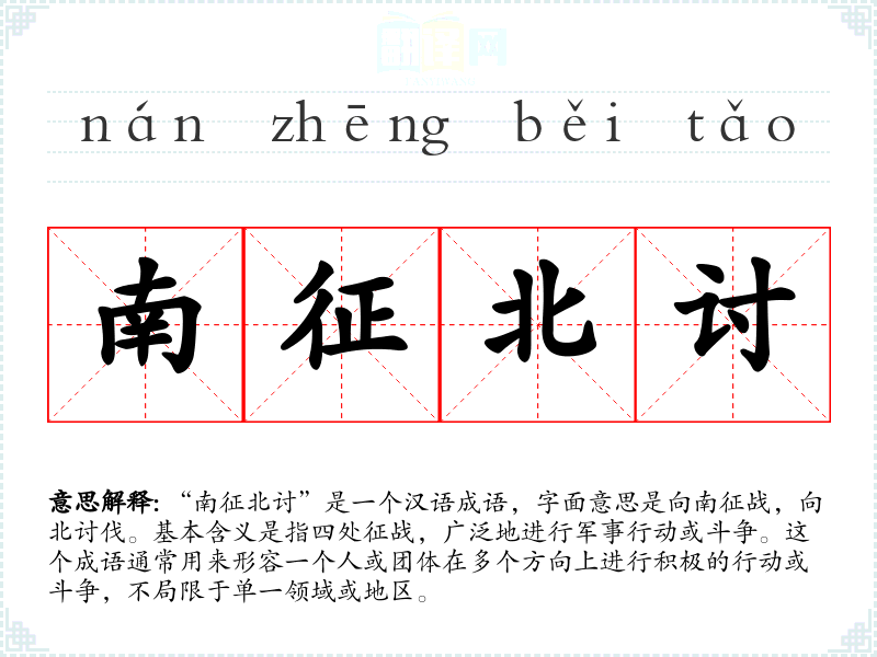 “南征北讨”是一个汉语成语,字面意思是向南征战,向北讨伐。基本含义是指四处征战,广泛地进行军事行动或斗争。这个成语通常用来形容一个人或团体在多个方向上进行积极的行动或斗争,不局限于单一领域或地区。