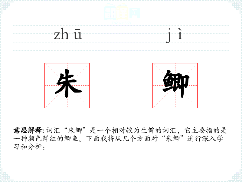 词汇“朱鲫”是一个相对较为生僻的词汇,它主要指的是一种颜色鲜红的鲫鱼。下面我将从几个方面对“朱鲫”进行深入学*和分析: