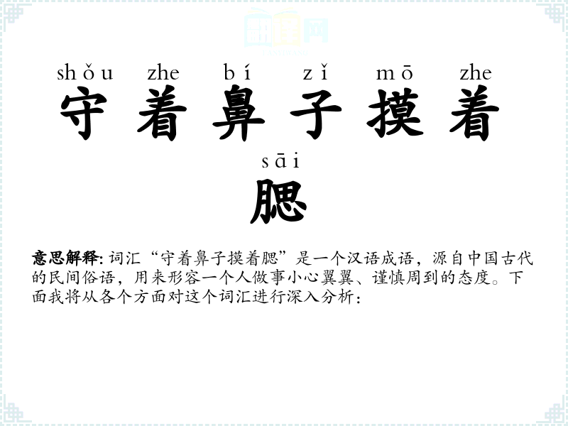 词汇“守着鼻子摸着腮”是一个汉语成语,源自**古代的民间俗语,用来形容一个人做事小心翼翼、谨慎周到的态度。下面我将从各个方面对这个词汇进行深入分析: