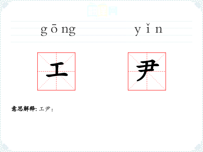 - 字面意思:工尹是一个古代汉语词汇,由“工”和“尹”两个字组成。
