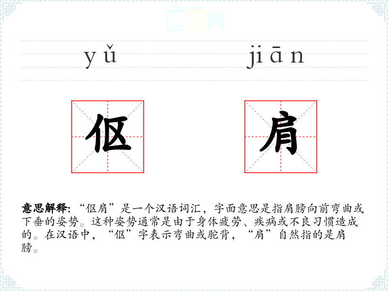 “伛肩”是一个汉语词汇,字面意思是指肩膀向前弯曲或下垂的姿势。这种姿势通常是由于身体疲劳、疾病或不良*惯造成的。在汉语中,“伛”字表示弯曲或驼背,“肩”自然指的是肩膀。