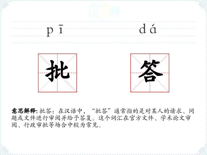 - 专业领域:在法律、行政、学术等领域,“批答”是一个正式的术语,用于描述对文件或请求的正式回应。