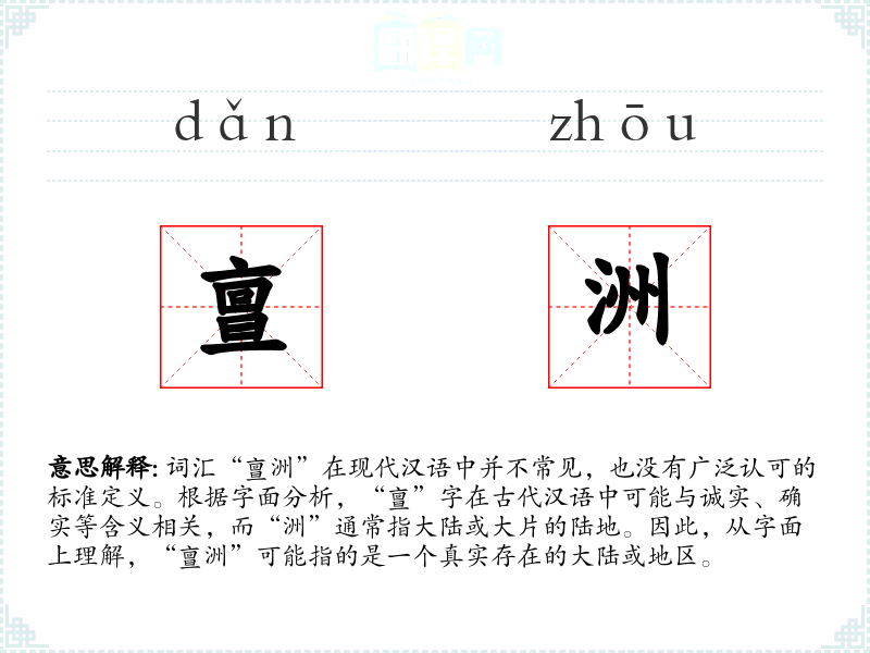 词汇“亶洲”在现代汉语中并不常见,也没有广泛认可的标准定义。根据字面分析,“亶”字在古代汉语中可能与诚实、确实等含义相关,而“洲”通常指大陆或大片的陆地。因此,从字面上理解,“亶洲”可能指的是一个真实存在的大陆或地区。