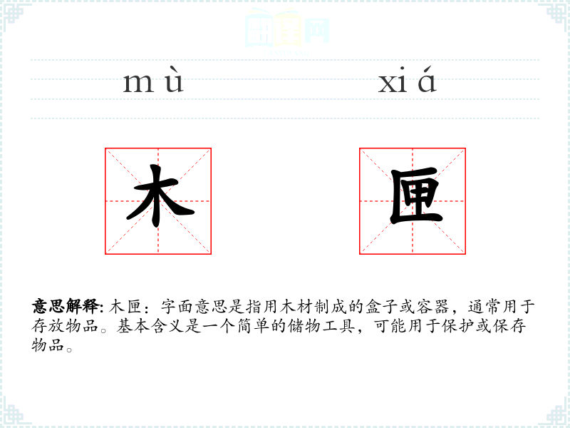 木匣:字面意思是指用木材制成的盒子或容器,通常用于存放物品。基本含义是一个简单的储物工具,可能用于保护或保存物品。