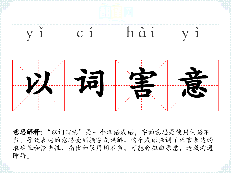 “以词害意”是一个汉语成语,字面意思是使用词语不当,导致表达的意思受到损害或误解。这个成语强调了语言表达的准确性和恰当性,指出如果用词不当,可能会扭曲原意,造成沟通障碍。