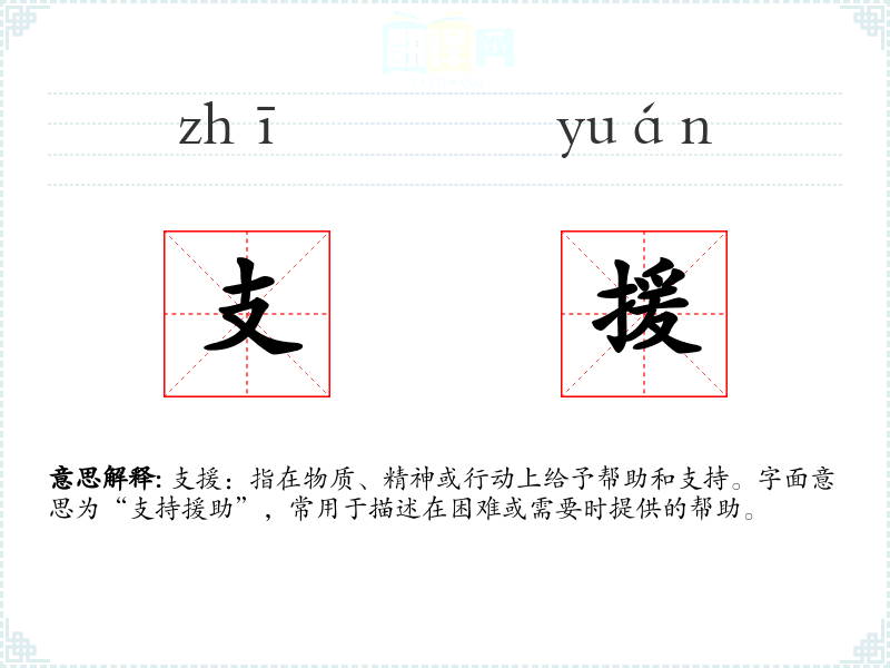 支援:指在物质、精神或行动上给予帮助和支持。字面意思为“支持援助”,常用于描述在困难或需要时提供的帮助。