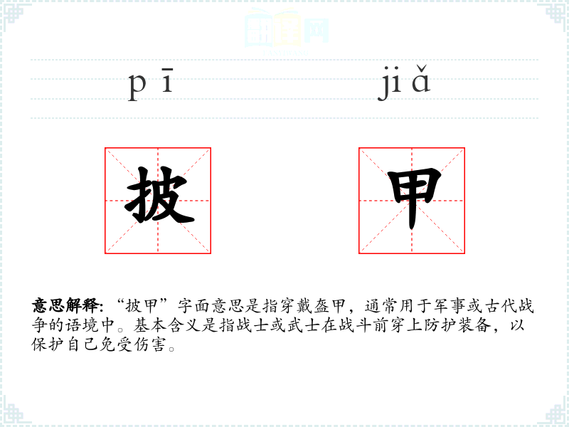 “披甲”字面意思是指穿戴盔甲,通常用于军事或古代战争的语境中。基本含义是指战士或武士在战斗前穿上防护装备,以保护自己免受伤害。