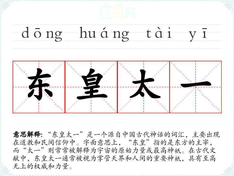同义词:天帝、玉皇大帝(在**神话中,这些词汇都指代至高无上的神祇) 反义词:凡人、尘世(这些词汇与“东皇太一”形成对比,强调神与人之间的区别)