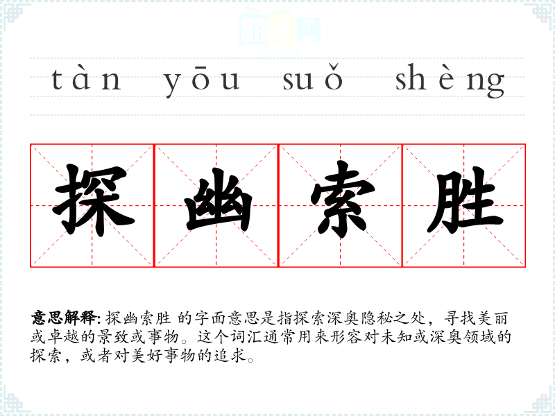 探幽索胜 的字面意思是指探索深奥隐秘之处,寻找美丽或卓越的景致或事物。这个词汇通常用来形容对未知或深奥领域的探索,或者对美好事物的追求。