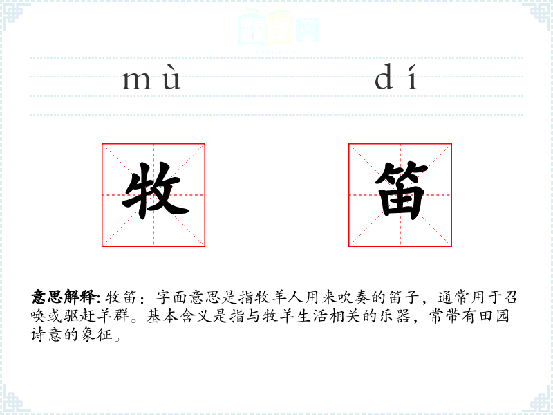 牧笛:字面意思是指牧羊人用来吹奏的笛子,通常用于召唤或驱赶羊群。基本含义是指与牧羊生活相关的乐器,常带有田园诗意的象征。
